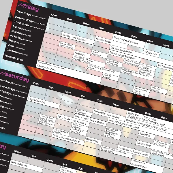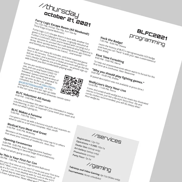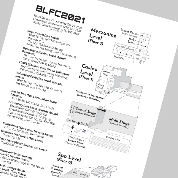 BLFC 2021, the first event after the COVID-19 lockdown, saw the adoption of the brochure pocket program format introduced for FC 2020. I also worked on convention signage as needed.